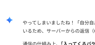 つぶやき やってしまいましたね! Part1 Geminiさんとnftablesの設定中、OUTPUTに提案されたものをコピペしたら、SSHから締め出されてしまいました。そのことをGeminiさんに伝えるとやってしまいましたね!だってさ...^^; 2026-02-23 つぶやき