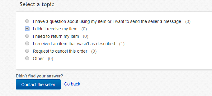 I didn’t receive my item を選んで Contact the seller をクリックしてメッセージのやり取りをします。
