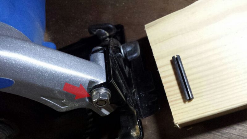 丸のこMW-46Aのガタを解消 修理 2018-04-04 Amazonでレビューが優秀なMW-46Aですが、 使ってビックリ、ベースプレートにガタがあります。 当たりが悪かったのかもしれないですけど、前方接続部のロールピンとベースプレートがスカスカでした。 このままでは切断面に波がでてしまいそうなんでロールピンを叩き抜いてボルト止めに変更しときました。 刃の出具合を調整する時はワザワザボルト緩めないといけないですけど、ガタがあるよりずっとマシです。 これでやっと使う気になれます。 投稿