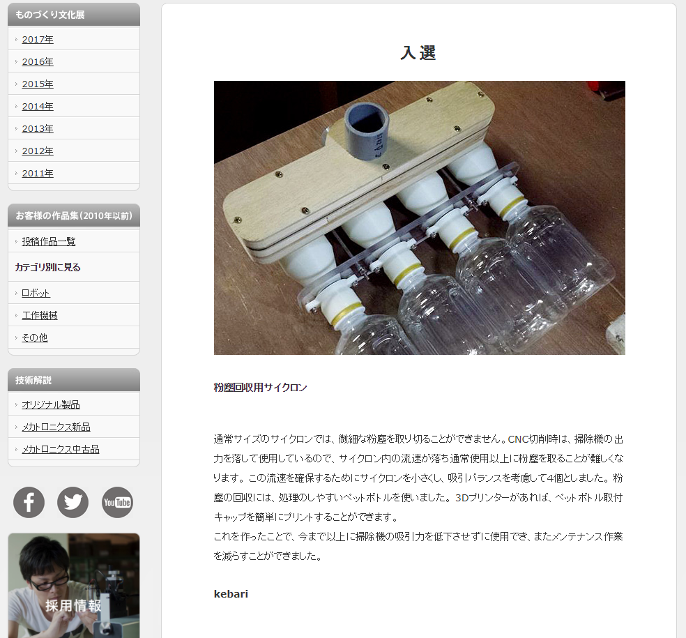 ORIGINALMINDさんのHPで、ものづくり文化展の作品募集というバナーを見て、その頃丁度実験中だった粉塵回収用サイクロンを応募してみようかと思い立ち、再設計して9月末に応募しておりました。