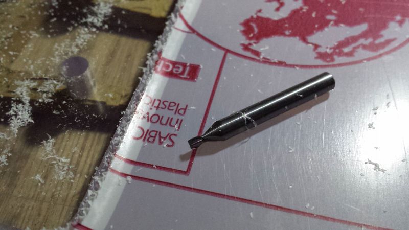 ポッキリ… CNC 2018-06-25 やっちゃいました。 違うことして戻ってきたらポッキリと折れてました。 油断しましたね。 刃長20mmのエンドミルが3mmに… 切削途中だからエンドミルが届くまでこのまま放置です。 原点セットするとき、自動でスクショを残すようにしてあるから切削対象物さえ動かなかったら原点を戻せます。今回は切削対象物をストッパーに当ててあるから動かしてしまったとしても大丈夫。 備えは大事です。 樹脂用エンドミルはちょいと高いんですよね。 もっと気を付けないと。。 投稿